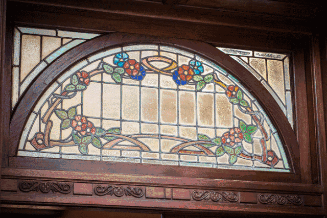 客廳中擺放著貴妃椅和各式的沙發、茶几。彩色的古董玻璃屏風,將整個房間一分為二。