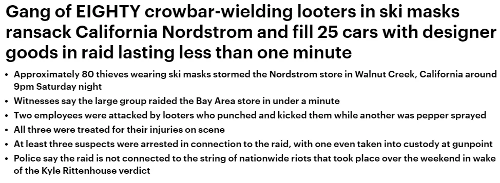 周六晚上,在灣區的核桃溪(Walnut Creek)一間Nordstrom商店,80名戴著滑雪面具、揮舞著撬棍的劫匪沖入該商店進行搶劫,不到1分鐘的作案時間,他們搶來的物品裝滿了25輛車,然後逃之夭夭。