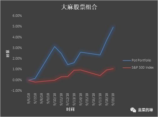 這套投資組合在最大回撤設定至8.51%后,前段已經投入交易。在貿易戰開打,市場上下波動起伏的狀況下,相比兩周內大盤(S&P500)1.06%的回報,大麻投資組合回報5%。目前看,投資不一定非要真碰葉子了。味兒確實挺大的。