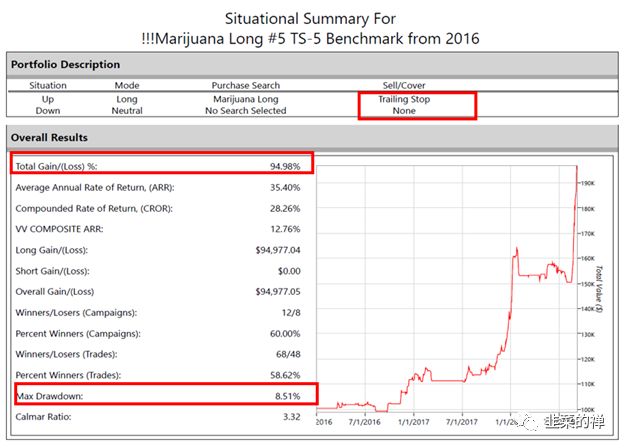 由正確資本(CorrigitCapital Group)的洪斌博士製作的大麻股票組合交易模型,測試后錄出94.8%的回報(12/31/2015至09/06/2018)。其中要點是因為這個新興行業尚在起步階段,系統會在行業指數處於上升趨勢時購買股票。此外會選擇其10 日均線價格大於25 日均線價格的個股。並事先設置並追蹤損失大於 5%時退出交易,並且在 3 天內不會再次購買相同的股票。追蹤止損均由機器人交易系統實時監控。