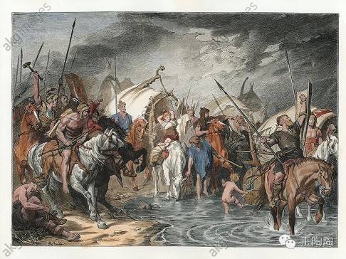 德國畫家Otto Knille的作品《日耳曼人在流亡途中》,講述了日耳曼難民為了逃避匈人屠殺,逃亡羅馬避難——這些日耳曼野蠻人最終滅亡了接納他們的羅馬帝國。