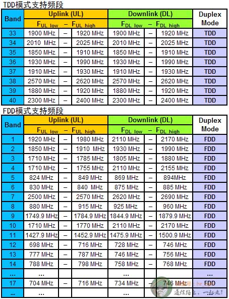 目前4G網路(LTE)分為TDD和FDD兩種模式,這兩種模式支持的頻段是不一樣的,他們是這樣劃分的。