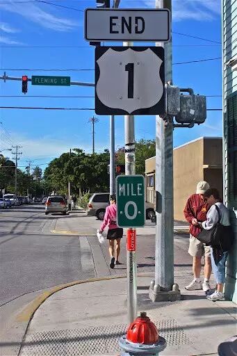 既然你走的是美國國家一號公路,開上你的車到1號公路的起止點吧!1號公路的起點和終點在同一個路口,分列馬路的兩邊。0 mile的標記也只有在這樣天涯海角的地方才會顯得理所當然。