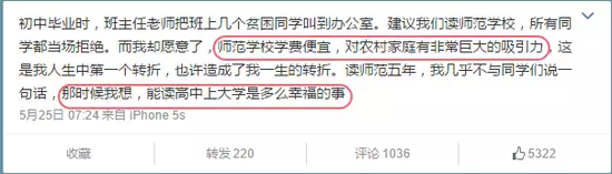 「師範學校學費便宜,對農村家庭有非常巨大的吸引力」,「那時候我想,能讀高中上大學是多麼幸福的事」。