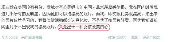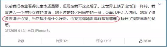「我曾進入一個年輕女孩的微博,他發了很多微博評論我,當然都不是什麼好話。而我覺得她講得非常有道理,解開了我數年的疑惑。」