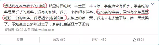 「想起我在奉節教書的時候」,「他父親的壽宴,有個菜是五毛錢一根的辣條,我想起來就掉眼淚」,「不知道這麼多年過去了,鄉親們生活好點了沒有」。