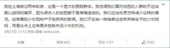 「我在上海做過兩年蟻族,這是一個龐大的弱勢群體。我覺得我們面對窮困的人群時不應當報以歧視和嘲笑,因為很多人的貧困都不是懶惰造成的。我們應當反思怎樣減少這樣的情況。經常看到少女廁所產子后丟棄的新聞。我們不應當一昧指責這些丟棄親生子的少女媽媽,而是社會上應有更多救助失足少女的機構。」