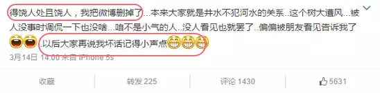 發博聲明后很快刪掉,因為「得饒人處且饒人」,「我被說一兩句也沒啥」,「下次說我壞話記得小聲點」。這種大度不管是不是裝出來的,至少娛樂圈裡很多人都做不到這點,分手了還熱衷中撕逼抹黑對方的更是大有人在(此處是不點名批評)。