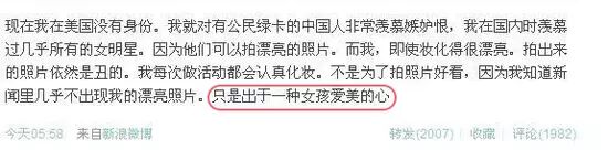 而她在5月27日的微博中這樣寫道:「我決定把徵婚標準降到只要有車有房就可以了。在美國,這些東西20萬就能買到。我一個洗腳妹干幾年都能掙下來。不如只要長得帥就好了。我養男人。」