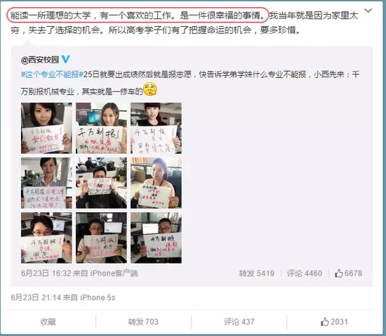 「能讀一所理想的大學,有一個喜歡的工作,是很幸福的事情。我當年就是因為家裡太窮,失去了選擇的機會。所以高考學子們要多珍惜。」