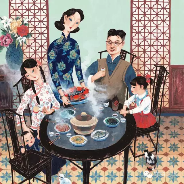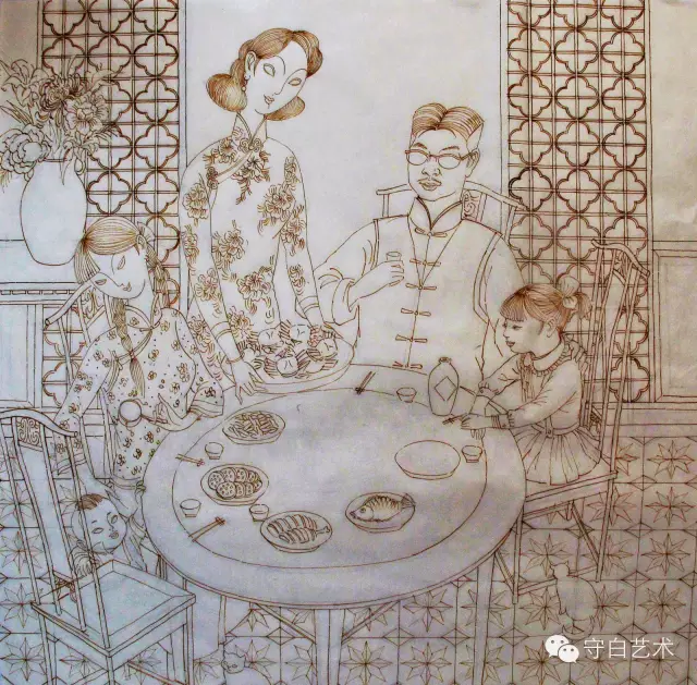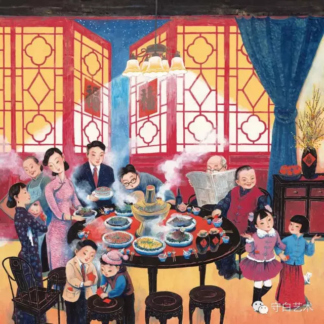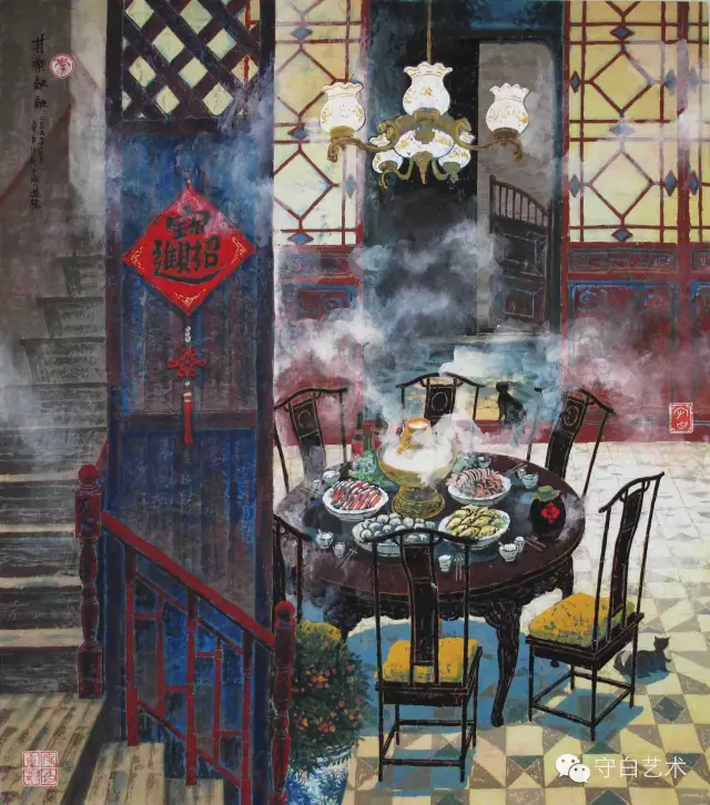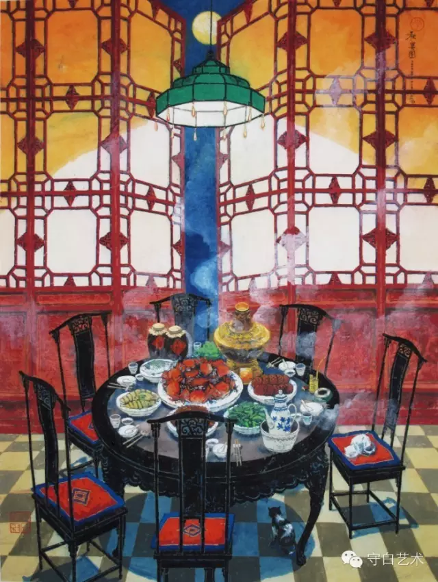 重彩畫《闔家團圓》70x70cm 2013年 李守白