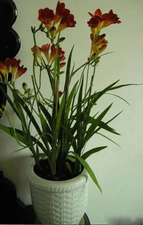 33、小蒼蘭:又名香雪蘭、洋晚香玉。它的葉片猶如一把把插在地上的小型寶劍,劍叢中抽出幾枝排滿金鈴般的花穗8朵左右,宛如一隻只金色的小漏斗,花色有鮮黃、純白、青紫、玫瑰紅等色,形態奇麗,它既有蘭花的幽香,有具桂花的芬芳。在室內擺放一盆,香氣濃郁醇正,使人頓覺清新舒暢。小蒼蘭習性是既怕寒有怕熱,當夏季炎熱時即進入休眠,天氣涼爽后球莖開始發芽生長和抽莖開花。生長適溫白天為18---20度,夜間為14---16度越冬溫度為6---7度,小蒼蘭為喜光植物,所以要求充足的光照,但在強光、高溫的條件下易出現徒長現象。它的花芽形成是在短日照條件下完成的,花芽形成后長日照對它的開花又有促進作用。小蒼蘭對水分的要求較為嚴格,即怕潮濕,又不耐乾旱。土壤含水量過多,易造成爛根;土壤缺水,生長受阻,葉色矢去光澤。每年9月中下旬栽種,每盆10個左右,花土可用腐葉土20%、園土50%、堆肥土20%、沙土10%混合配製。小蒼蘭有休眠習性,開完花五月左右葉子枯黃后可將球莖從盆內倒出,清除枯葉,將球莖涼干後放陰涼通風處儲藏。