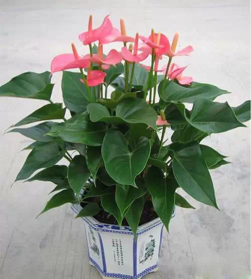 38、火鶴花:屬多年生常綠草本植物。又名安祖花、紅鶴芋、火燭花等。株高30---50厘米,花姿奇美。性喜溫暖多濕及半陰環境,忌強光直射,不耐寒。夏季早晚給予陽光照射,中午前後注意遮蔭、經常向葉面噴清水,澆水要注意乾濕相間。盆土選用腐葉土或泥炭土、苔鮮再加少量園土和木炭以及過磷酸鈣的混合基質為好。