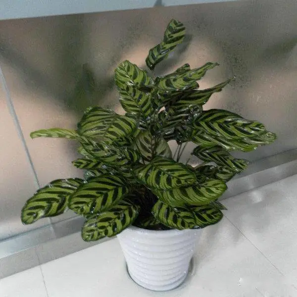30、孔雀竹芋:又名藍花蕉,株小形美,葉色華美,葉面斑紋有如栩栩如生的孔雀開屏.。孔雀竹芋為竹芋科多年生常綠草木植物,性喜高溫多濕和半陰環境,耐陰性較強,在室內明亮散射光條件下生長良好,生長適宜溫度為18---22度,要求疏鬆和肥沃的培養土。夏季切忌強光直射,否則易引起葉緣枯焦。環境空氣要流通,經常向葉面噴清水。其它竹芋養殖與此基本相同。