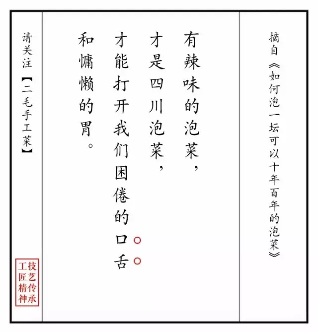 如何挑選和浸制泡菜罈子,將在書中的長文里介紹。罈子他有,現在需要的首先是兩個石頭。泡泡菜,要石頭幹什麼。我們吃泡菜,我們不吃石頭。但是,要想有一壇好泡菜,石頭是不能少的。要河裡的鵝卵石,青色,質地緊密的最好。還必須是即使夏天、水溫也非常涼冷的河裡卵石。像成都都江堰岷江上游里的。這裡的江水,是萬年雪山的冰雪融化匯聚,水中的石頭,在清澈冰涼中浸泡了千百年,石骨寒透。即使大熱天,只要在蔭涼之處,這樣的石頭摸起來,依然冰磬。性喜寒涼的泡菜,有這樣的石頭養著,才會久泡而不軟,硬脆爽口。而且,石頭在壇底,有吸附之用,鹽水就清亮。兩個石頭,一個鎮底,一個壓在泡菜之上,菜靜而泡,方能長久。不過,江河上船家的泡菜,卻不需要鎮壓,倒是船隨波動,罈子中的鹽水成了活水,泡出的菜,有另一種風味。