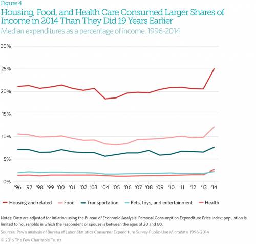 下圖是1996至2014年支出佔比(從上至下分別為:住房、食物、交通、娛樂、健康):