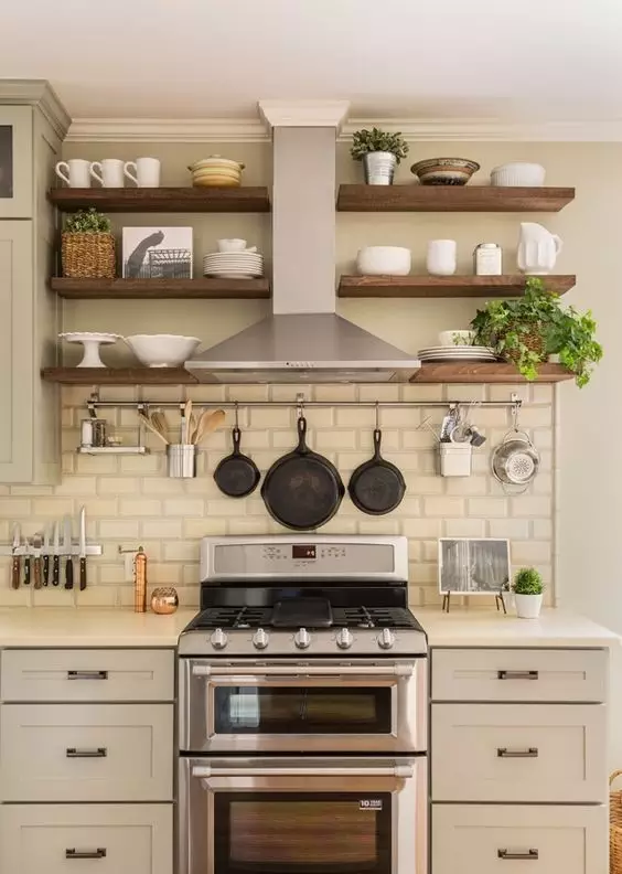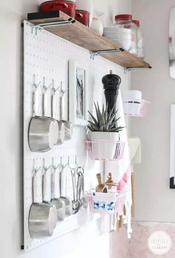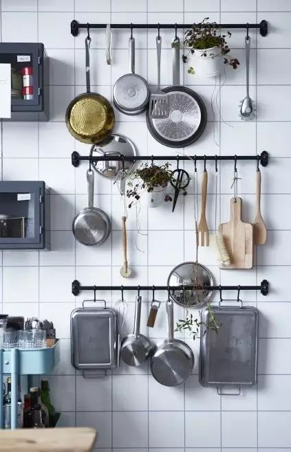 東西多,就把牆面利用起來。安一塊洞洞板,放上橫板和掛鉤,既能夠掛鍋放碗,還能放幾盆盆栽,給廚房帶來一抹清新~