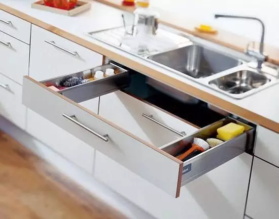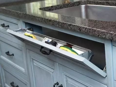 很多人覺得水槽不便於收納,其實不然。像下圖這樣在洗碗槽邊上做個小小的拉櫃,裝兩個凹槽用來放洗碗布、海綿等洗滌用品,美觀又便利。