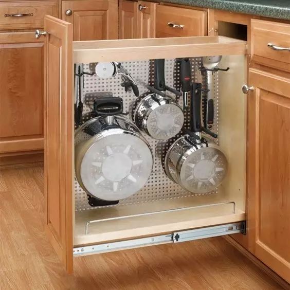 灶台底下安一個抽拉式的置物架,拉取方便~