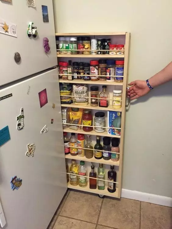 冰箱和牆面或操作台間通常會有間隙,可以根據空隙大小定製一個帶輪子的置物架,放各種瓶瓶罐罐,也方便拉進拉出。