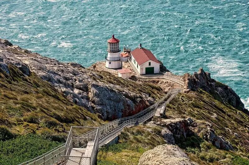 北灣伸出大海的海角,上面還有更小的幾個小角,地勢很高,據說是西海岸風最大、霧最濃的地方,於是前人在這裡修了一座燈塔,1870年就開始工作了。現在成為了供遊客參觀的歷史遺迹,從停車場到燈塔大概300多級台階;燈塔開放時間有限,可能因天氣狀況臨時關閉,要提前查好。Point Reyes上還有很多trails,比如旁邊一個小角上的Chimney Rock Trail、去看海邊瀑布的Palomarin Trailhead to Alamere Falls Trail,風景好而且很具有挑戰性~