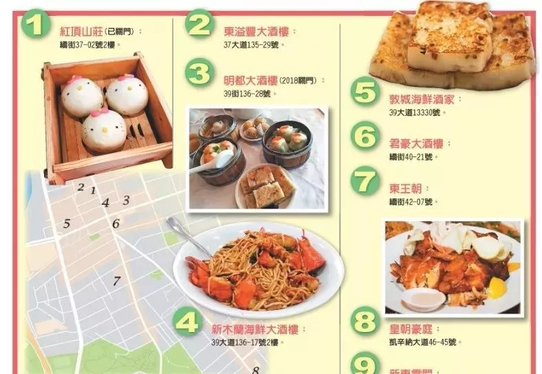 大酒樓如東溢豐、敦城、皇朝豪庭、明都等,雖然部分有改名過,但都已在法拉盛營業十年以上。39大道飛越皇后2008年啟用后,木蘭海鮮大酒樓進駐,相比傳統酒樓,裝潢大幅提升。2014年君豪大酒樓開幕,更以氣派場地與地鐵站入口旁黃金位置,搶走大量舉辦喜慶婚宴的顧客。接著2016年東雲閣海鮮酒家與紅頂山莊大酒樓相繼開張,店家也開始打價格戰,紛打出大、中、小點一律2.5元。