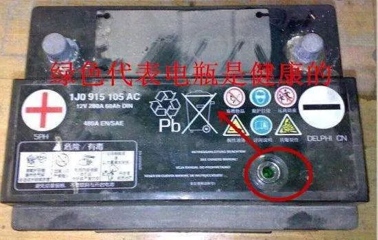 免維護蓄電池上都有一個觀察孔,觀察孔的燈顯示蓄電池工作是否良好,綠色則為良好,黑色則需要更換蓄電池,不過有些車主也會反映這個燈不太靠譜,明明是綠色也無法啟動汽車,觀察孔作為簡單參考吧。