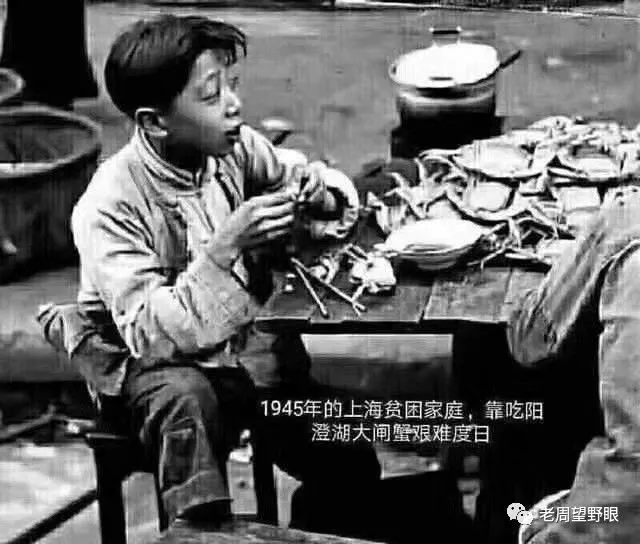 吃大閘蟹本該是「九雌十雄」,要到陰曆九月秋風瑟瑟時才好。傳統上中秋節的餐桌上應該是鴨子芋艿毛豆,吃大閘蟹的還要再等等的。不過現在的人心急,難得國慶中秋放個假,不來幾隻蟹好像說不過去,於是大閘蟹提前上市了。每年吃大閘蟹的季節總有朋友曬照片,下面還打一行字:1945年的上海貧困家庭,靠吃陽澄湖大閘蟹艱難度日……就是這張圖:
