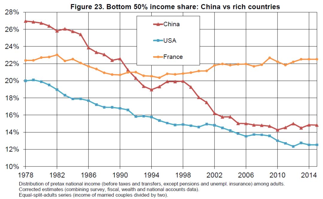 在圖中,Piketty統計了1978~2015年中國前1%人群的收入佔比,從1978年的6%,上升到了2015年的14%。在另一張圖中,他統計了中國后50%人的財富佔比:從1978年的27%下降到了2015年的15%。