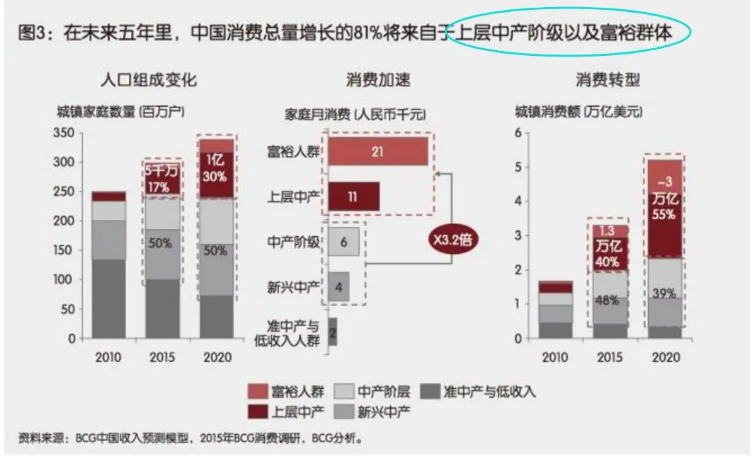 在資產價格突飛猛進的過去10年,中國的財富以前所未有的速度向前1%人群集中,同時負債也以前所未有的速度向中間夾心層集中,最終形成"頂層強,中間弱,底層大"的結構,用大前研一的總結就是:M型社會。對此,BCG在2016年就直截了當地指出:中國消費總量增長的81%將來自於上層中產階級以及富裕群體。