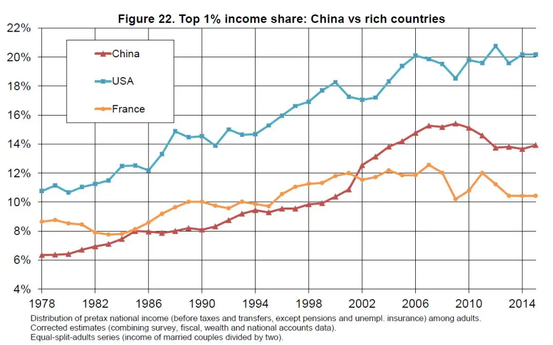 1%是個很有意義的分界點,著名經濟學家Thomas Piketty,同時也是《21世紀資本論》作者,在2017年4月發表了一篇長達76頁的報告,《中國資本積累、私人財富和貧富差距,1978-2015》,在論文中,他分析了中國1%人群的財富佔比,下面是論文中兩張圖: