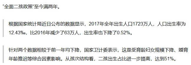為什麼高層會選擇取消持續幾十年的計劃生育政策,我想這是和近些年開放二胎的效果遠不及預期有關。計生委曾樂觀的預期開放二胎后每年會多出200萬以上的新生兒,但是實際上的生育數據遠遠低於預期,生育數據下滑的非常厲害,在這種情況下,開放全面生育是勢在必行的,如果開放全面生育還不能挽救中國斷崖式下滑的人口數據,那麼下一步恐怕就是採用補貼進行獎勵生育了。