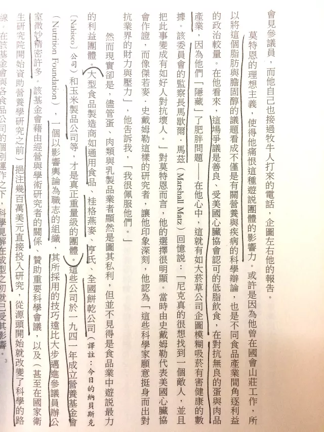 ...該委員會最終接受了這套健康飲食,而這也吻合了莫特恩(膳食指南撰寫人,無任何營養學背景)自身對於肉類、乳製品、與蛋業的懷疑觀點。基於環境與倫理因素,莫特恩對這些產業抱持反對意見,而且他相信肉類產業是完全腐敗的,因為他曾親身經驗...,全國牧牛人協會的成員經常大步邁進辦公室來會見參與員。