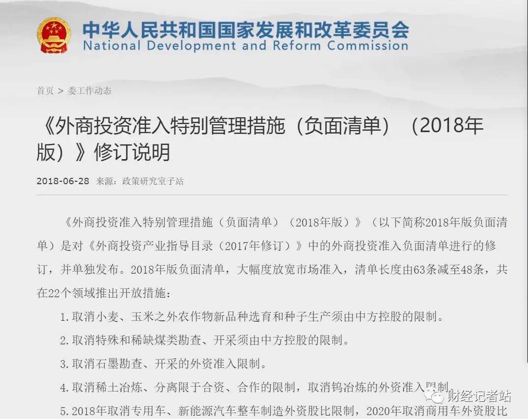 國家發展改革委和商務部對外發布《外商投資准入特別管理措施 (負面清單) (2018年版)》,大幅度放寬市場准入,清單長度由63條減至48條,共在22個領域推出開放措施,外資進入銀行、證券、汽車製造、電網建設、鐵路幹線建設網建設等限制將取消: