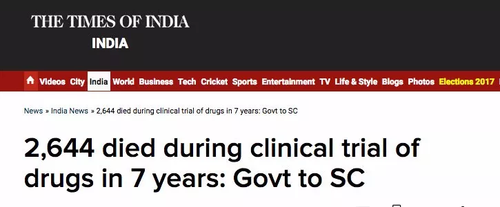 《印度時報》曾於2013年報道稱,在2007至2013年年間,約有2600名印度人死於藥物臨床試驗中。而2015年的數據則顯示,從2013-2015年有1335人死於臨床試驗。據估計,參與人體小白鼠實驗的印度人,多達60萬人。