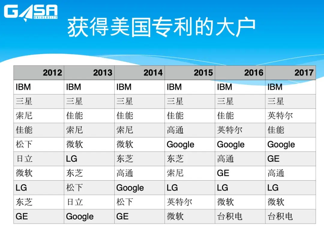 以美國專利來衡量,第一名永遠是IBM。第二名是三星。這其中Google是一個特例。Google以前並不重視專利,但因為一些官司之後,開始意識到專利的重要性了,隨後全體員工都開始在專利方面下了大工夫。