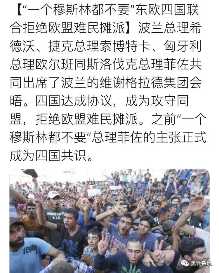 東歐的波蘭、匈牙利、捷克、斯洛伐克這四國,口徑一致的對外宣稱「非法移民穆斯林一個都不要」,特別是波蘭的法律公正黨議員多米尼克曾經很強硬的說:
