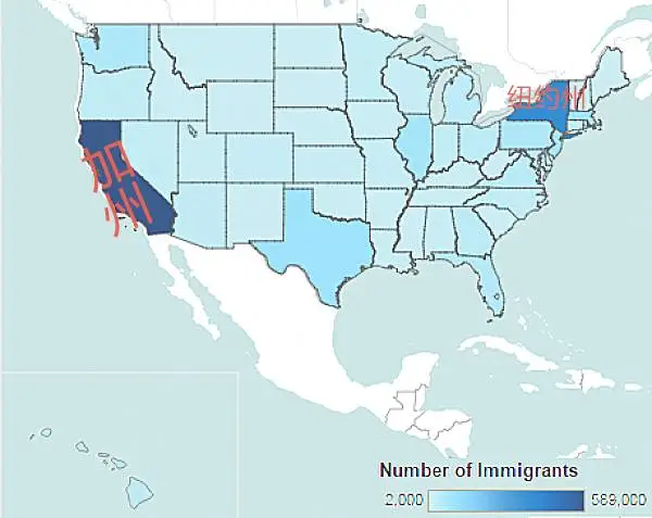 (2009-2013年中國移民在美國各州的分布圖,顏色越深數量越多,圖片源自美國移民政策研究所/MPI)