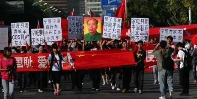 2012年9月的「抵制日貨」行動,由「憤青」組成的遊行隊伍打出抵制日貨的標語。(圖片來源:中國經濟周刊)