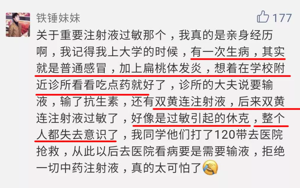 患者注射中成藥液後過敏的例子,在知乎、論壇上一搜一大堆。連我的同事朋友也提供了一些案例。