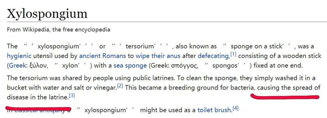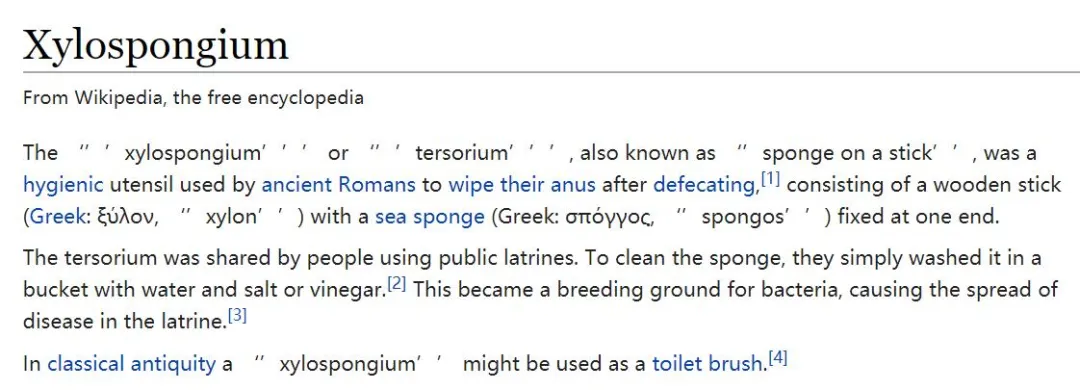 繼續深入研究了一下維基百科關於Xylospongium的詞條,我驚奇的發現,Xylospongium這東西竟然不是一次性的,它是重複使用的。也就是說A用完了,在混合了醋或鹽的裝水石槽子里涮一下消消毒,再遞給B用,B用完禮貌的說一聲謝謝,再遞給2B用。每一個Xylospongium光顧過的屁股,都會在它上面留下痕迹,據說這就是最早的區塊鏈。不過......