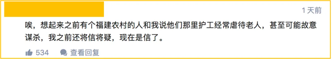 想起來之前有個福建農村的人和我說他們那裡護工經常虐待老人,甚至可能故意謀殺,我之前還將信將疑,現在是信了。