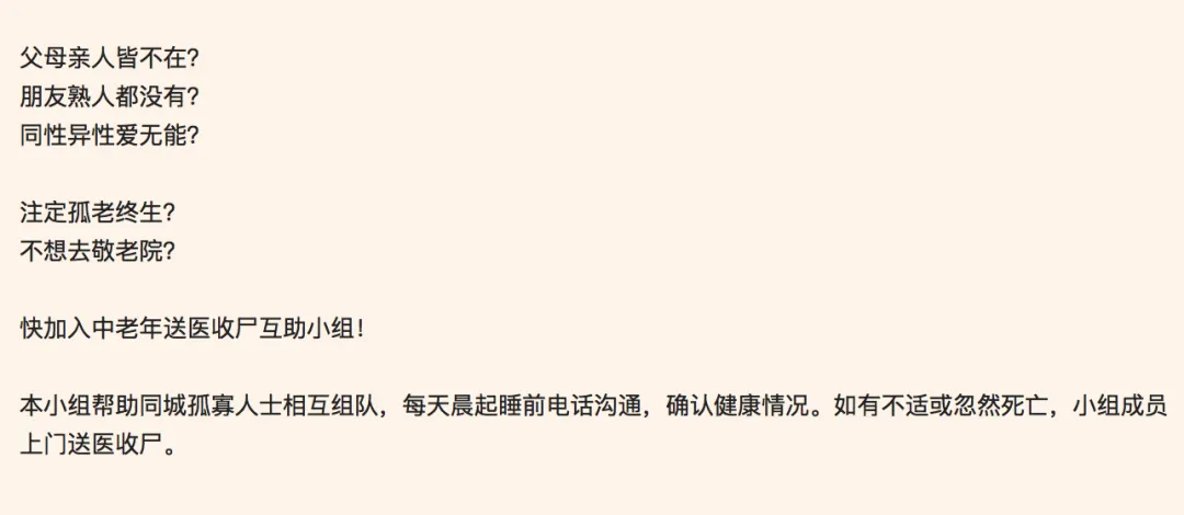 名字叫:孤寡人士中老年送醫收屍互助小組。