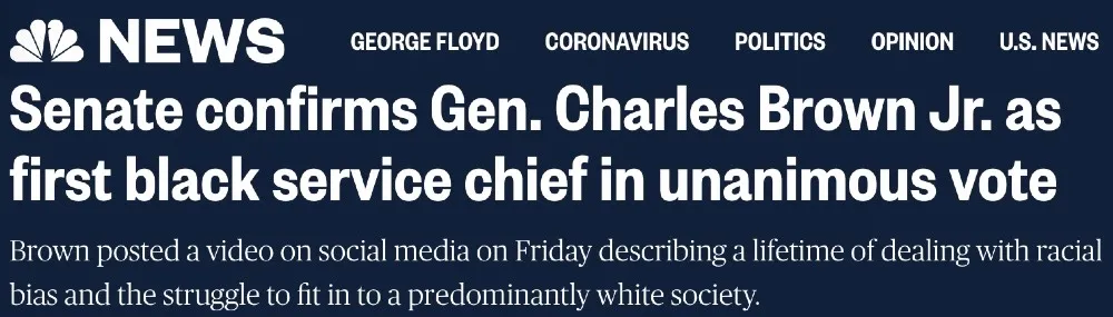參議院周二以98:0票投出了美國史上首位非裔空軍參謀長Charles Q. Brown Jr.。在投票前這位非裔空軍參謀長曾發布視頻,表達了對弗洛伊德及所有遭受不公平待遇非裔美國人的同情,並講述了自己作為非裔在軍中遭受的歧視和質疑。