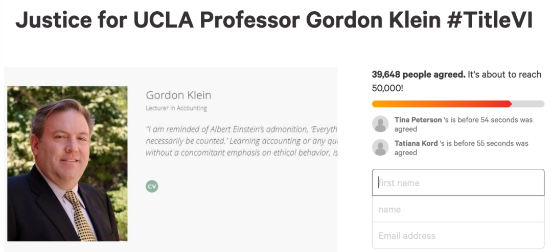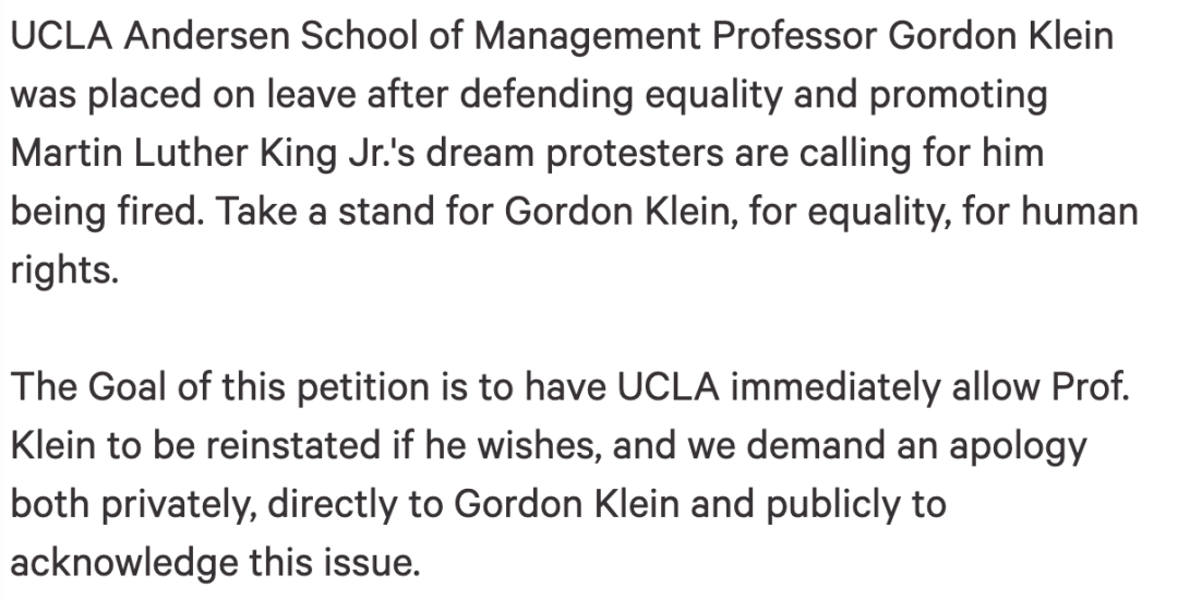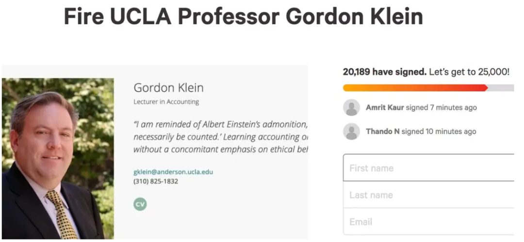但是憤怒的學生根本沒有買賬,反而在美國請願網站change.org上請求開除Gordon Klein教授,因為他對學生進行嘲諷,並且是一個「極度種族主義者」。很快就超過20000人響應了這個請求。