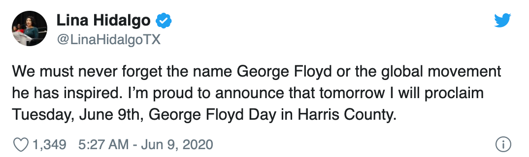 休斯頓法官Lina Hidalgo宣布,6月9日在Harris County被定為George Floyd Day,以紀念因Floyd而引發的全球行抗議活動。