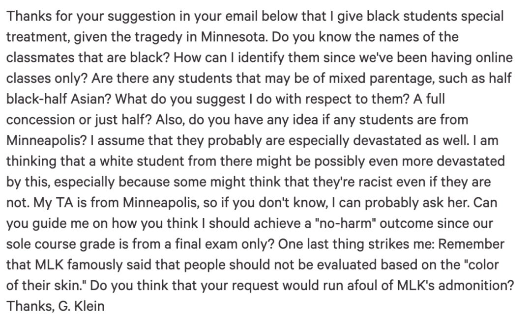 對此,Klein犀利地反駁,「要我給黑人學生優待,你知道他們的名字嗎?鑒於現在只有網路課程,我如何辨別哪一個是黑人學生、哪一個不是?混血兒怎麼辦?一半亞洲血統一半黑人血統,我是需要全部讓步還是讓一半?」另外,Klein認為,那些同樣來自明尼阿波利斯的白人學生怎麼辦?他們可能會被認為是種族主義者,即使他們並不是。