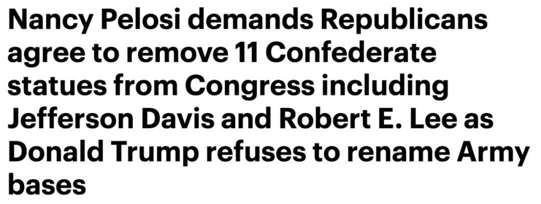 昨日,佩洛西向圖書館聯合委員會主席致信,呼籲移除國會大廈中所有南方聯邦人物的雕像,因為這些雕像代表著「野蠻和殘忍」,是對美國理想的「荒唐侮辱」。(內戰時,南方實行的是種植園黑人奴隸制)。