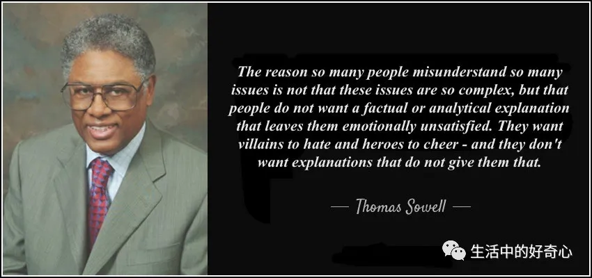 "那麼多人誤解那麼多問題的原因是那些問題都很複雜,但是那些人不想要一些無法讓他們情感上得到滿足的來自事實或者分析的解讀。他們想要的是可以憎恨的惡棍和值得歡呼的英雄,而這些是解讀給不了他們的。"- Thomas Sowell