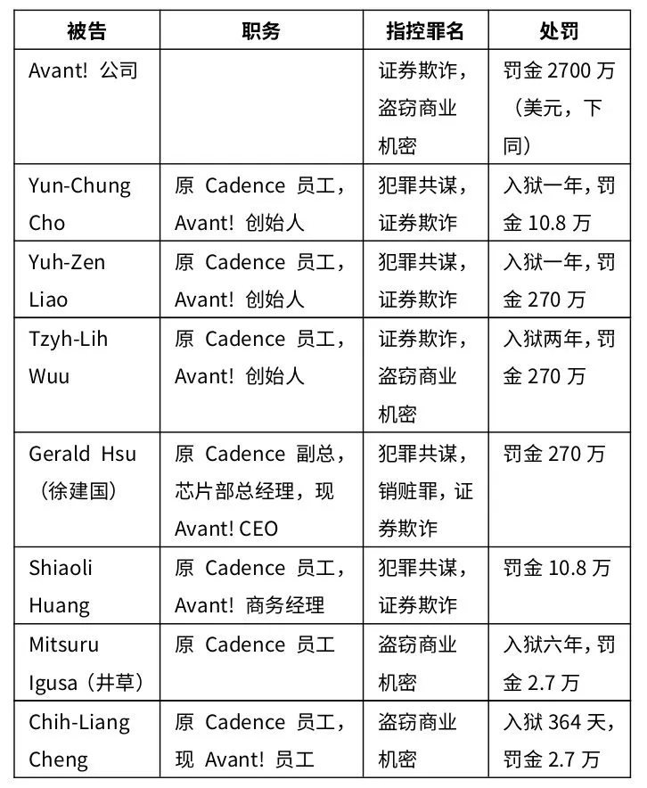 刑罰之外,另有民事法庭判 Avant! 賠償 Cadence 1.95 億美元,創下矽谷知識產權官司中最高賠償金額記錄。(然而這點錢對 Avant! 來說不算什麼。也就是符合律師的戰略,「大不了賠他們一點」。)